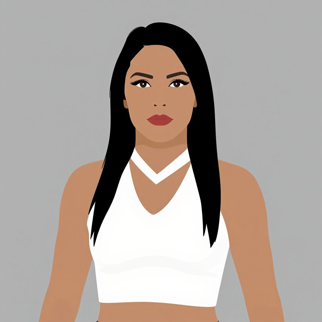 Digital illustration of a woman with long black hair, brown skin, red lips, and wearing a white crop top, against a light blue background.