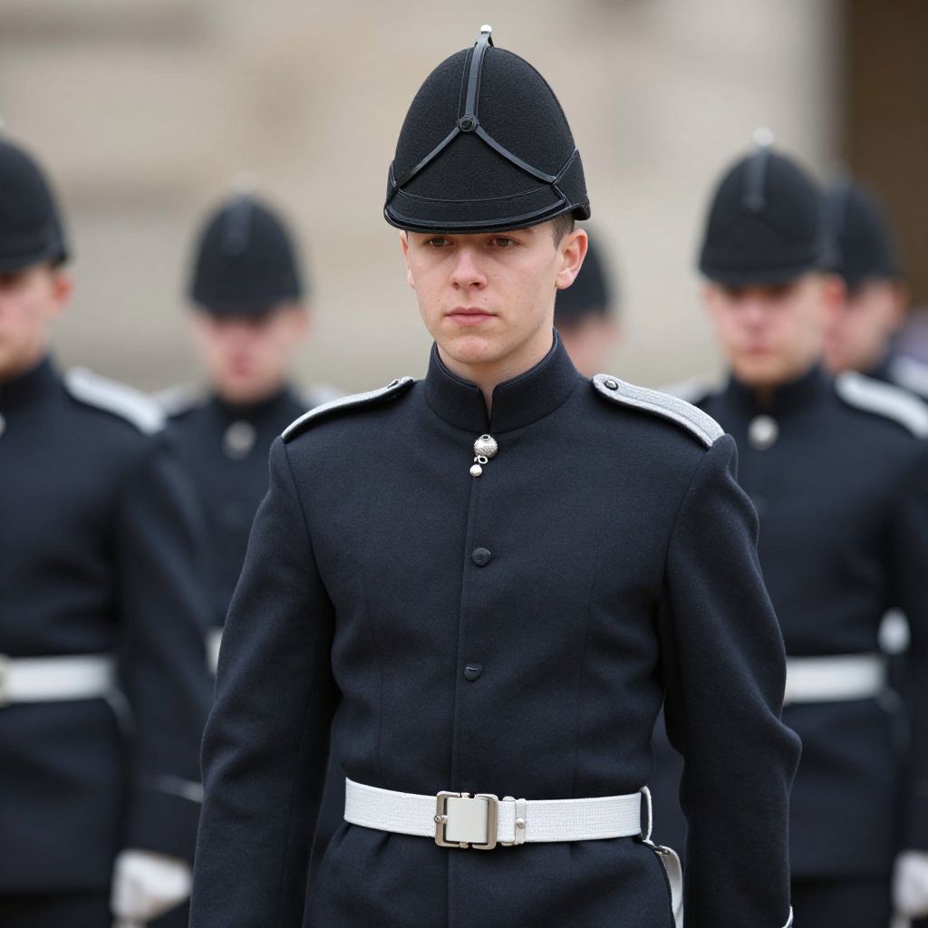 Royal british guard costume, uniform, military uniform, hat, military, male focus, blurry, multiple boys, black hair, solo focus, realistic, blurry background, shako cap, 1boy, belt, black headwear, jacket, closed mouth