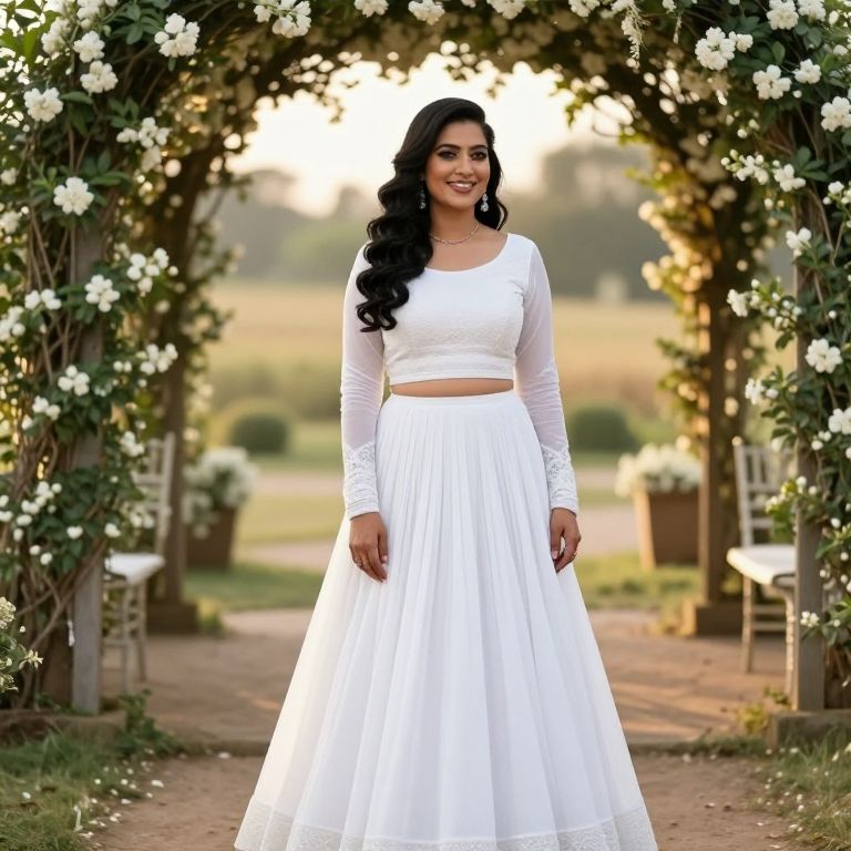 Photograph of a smiling South Asian woman with long, wavy black hair standing under a floral archway. She wears a white, long-sleeved, crop-top with intricate lace detailing and a full, pleated skirt. Her makeup is subtle, accentuating her natural beauty. The archway is adorned with white flowers and greenery, creating a romantic, rustic setting. The background shows a sunlit, grassy field with blurred trees and a wooden chair on either side. The overall scene is bright and serene, emphasizing the woman's elegant white attire and the natural beauty surrounding her.