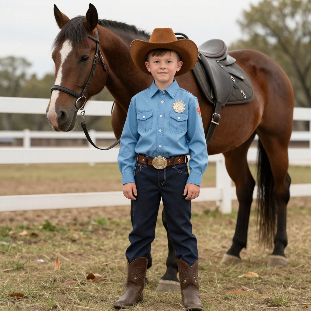Sheriff Costume Boy, boy in cowboy outfit standing in front of a horse in a ranch