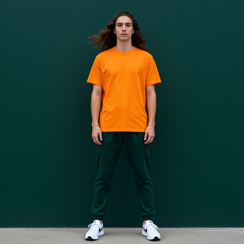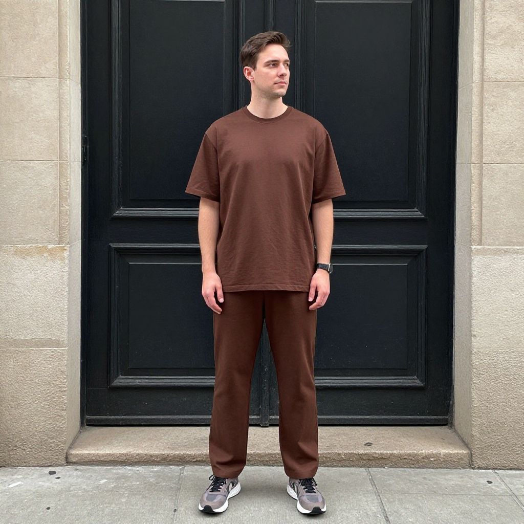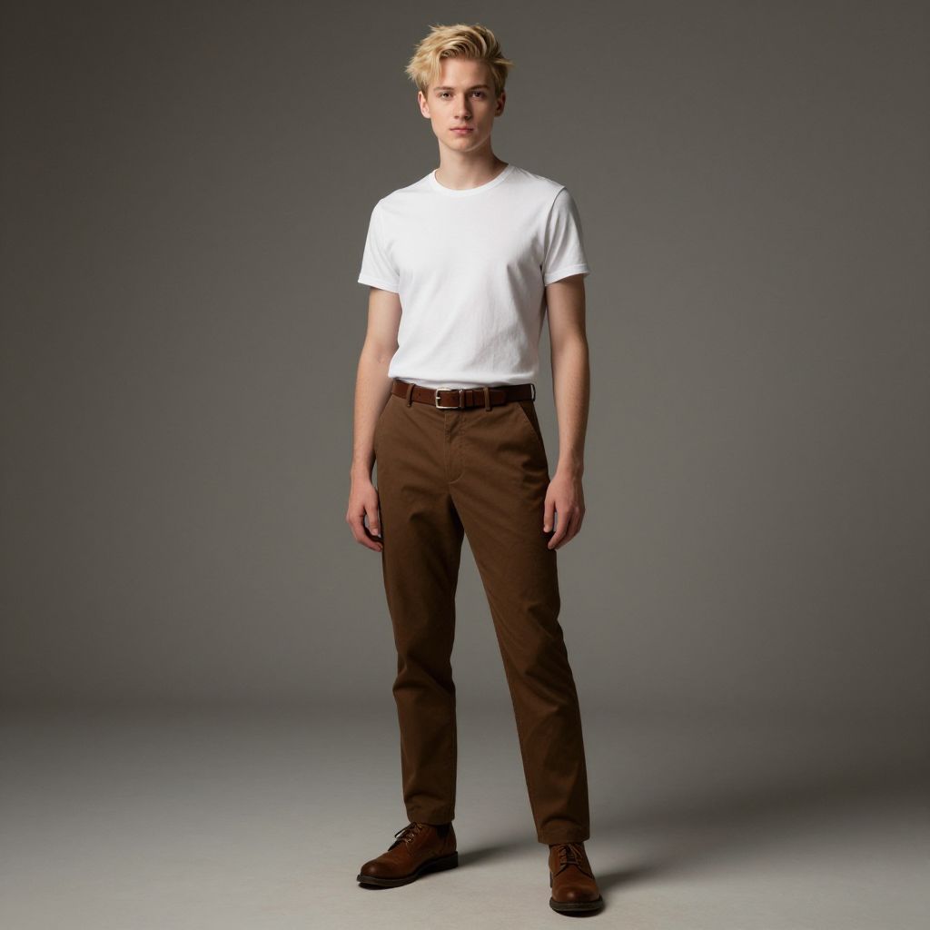 Photograph of a young man with short dark hair, wearing a brown t-shirt, brown pants, black and white sneakers, standing in front of a