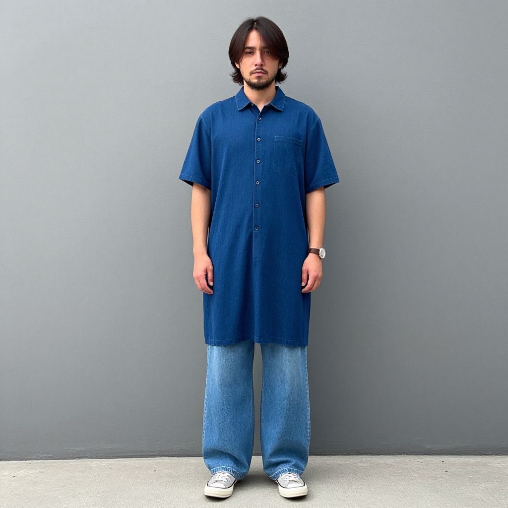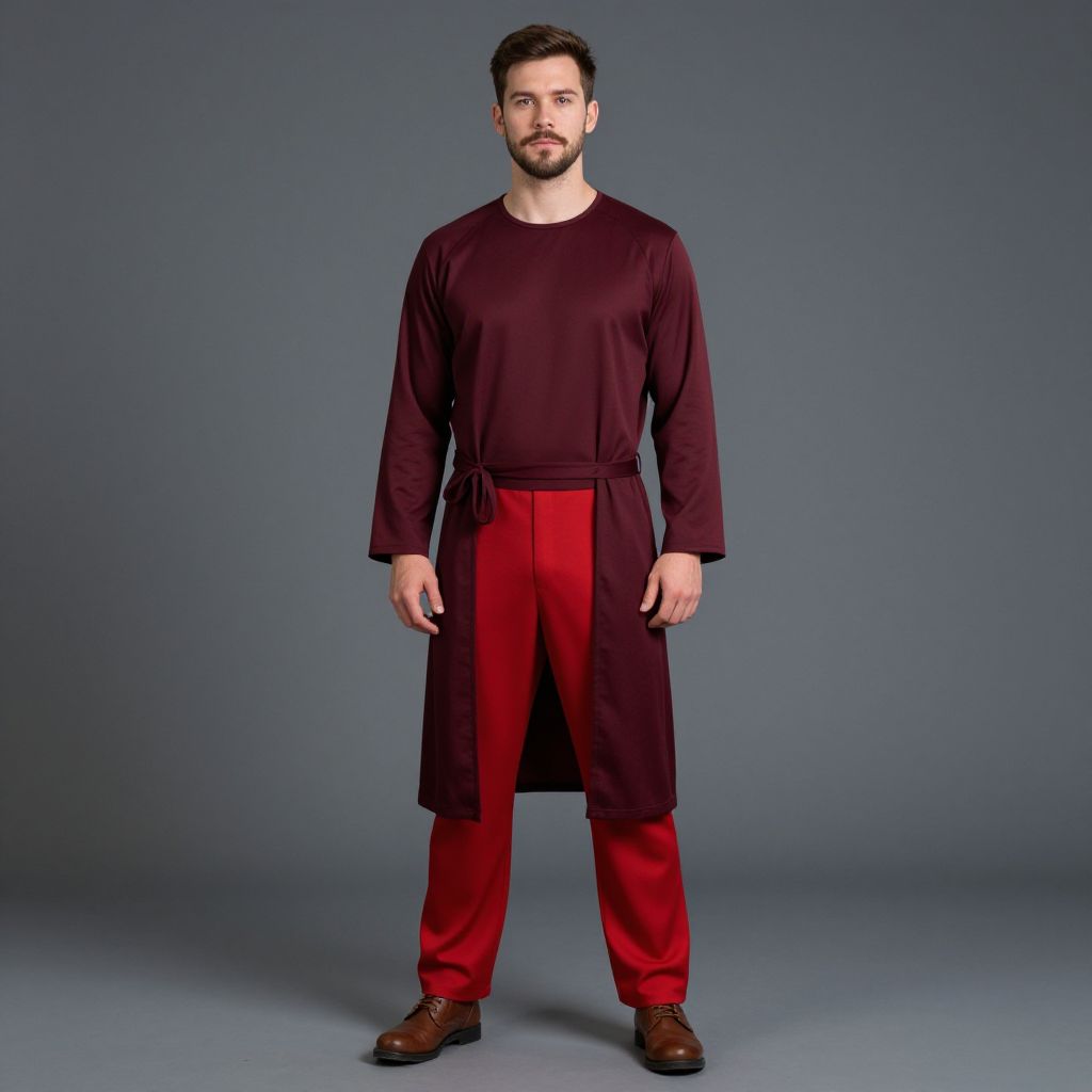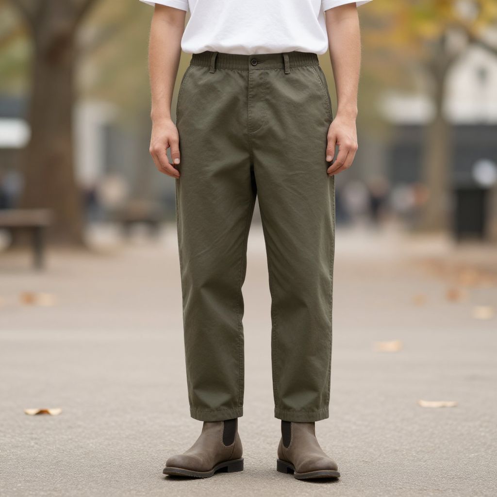 Photograph of a young man with short dark hair, wearing a brown t-shirt, brown pants, black and white sneakers, standing in front of a
