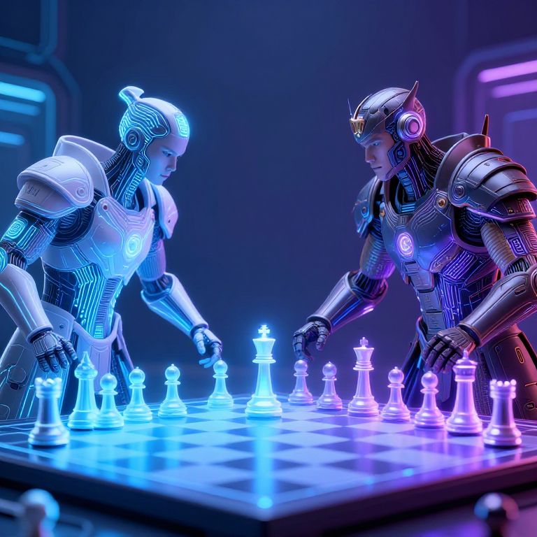 Photorealistic CGI of two glowing, futuristic robotic warriors playing a neon-lit chess game in a dark, high-tech laboratory.
