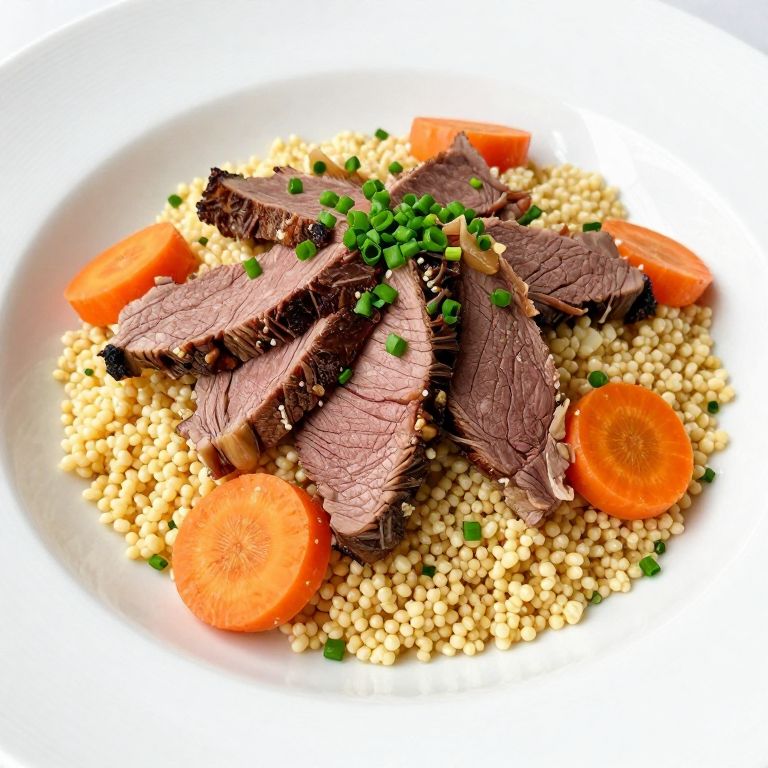 Crisp golden couscous topped with tender slices of corned beef and vibrant orange carrot rounds, garnished with finely chopped green chives, presented on a pristine white plate.