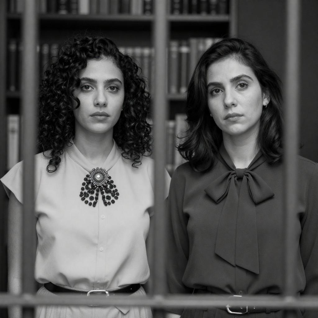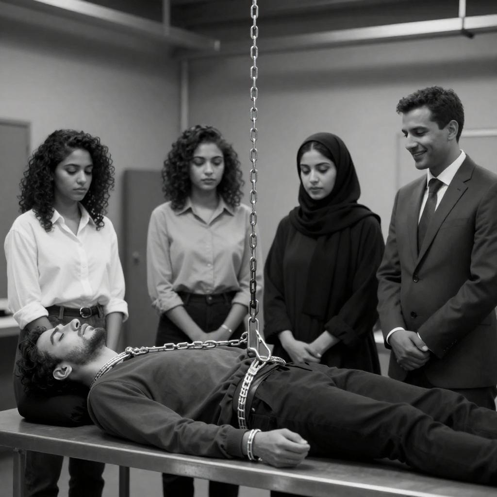 Black and white photograph of five people. A man lies bound and strapped to a metal table, head tilted back. Four people stand around: two women with curly hair in light clothing, a woman in a black hijab, and a man in a suit. The man on the table wears dark clothing. Chains hang from the ceiling. The background is industrial with metallic elements. The women's expressions are focused, the man's expression is neutral, and the hijab-wearing woman's expression is calm. The man in the suit smiles.