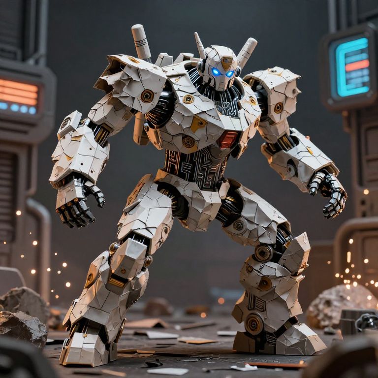 Rock paper robot in a dynamic battle pose, intricate circuitry mixed with crumpled paper armor, set against a dystopian industrial background with sparks and glowing panels, high detail.