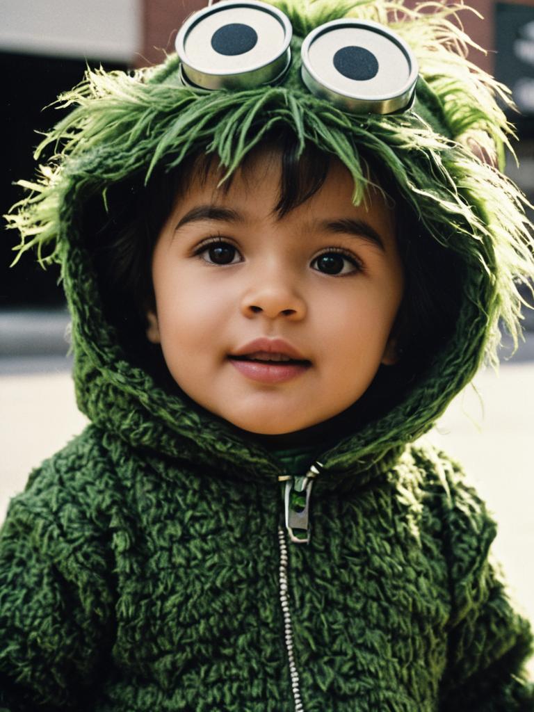 Toddler in Oscar the Grouch Costume, close-up detailed headshot, photorealistic realism
