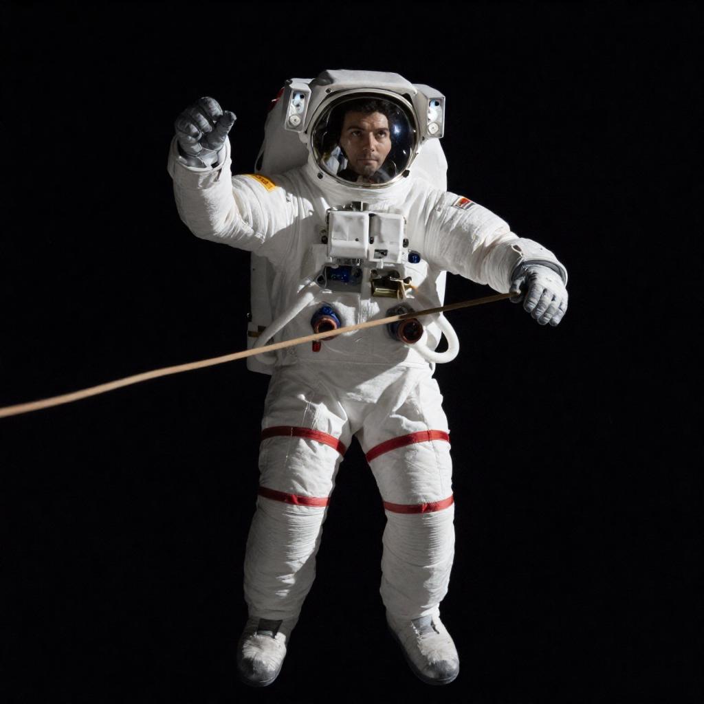 Photograph of an astronaut floating in space, wearing a white spacesuit with a dark background. The astronaut has a medium build, short dark hair, and is holding a long, thin, orange tether. His arms are outstretched, and he is looking slightly upward. The tether curves around him, adding a sense of motion.