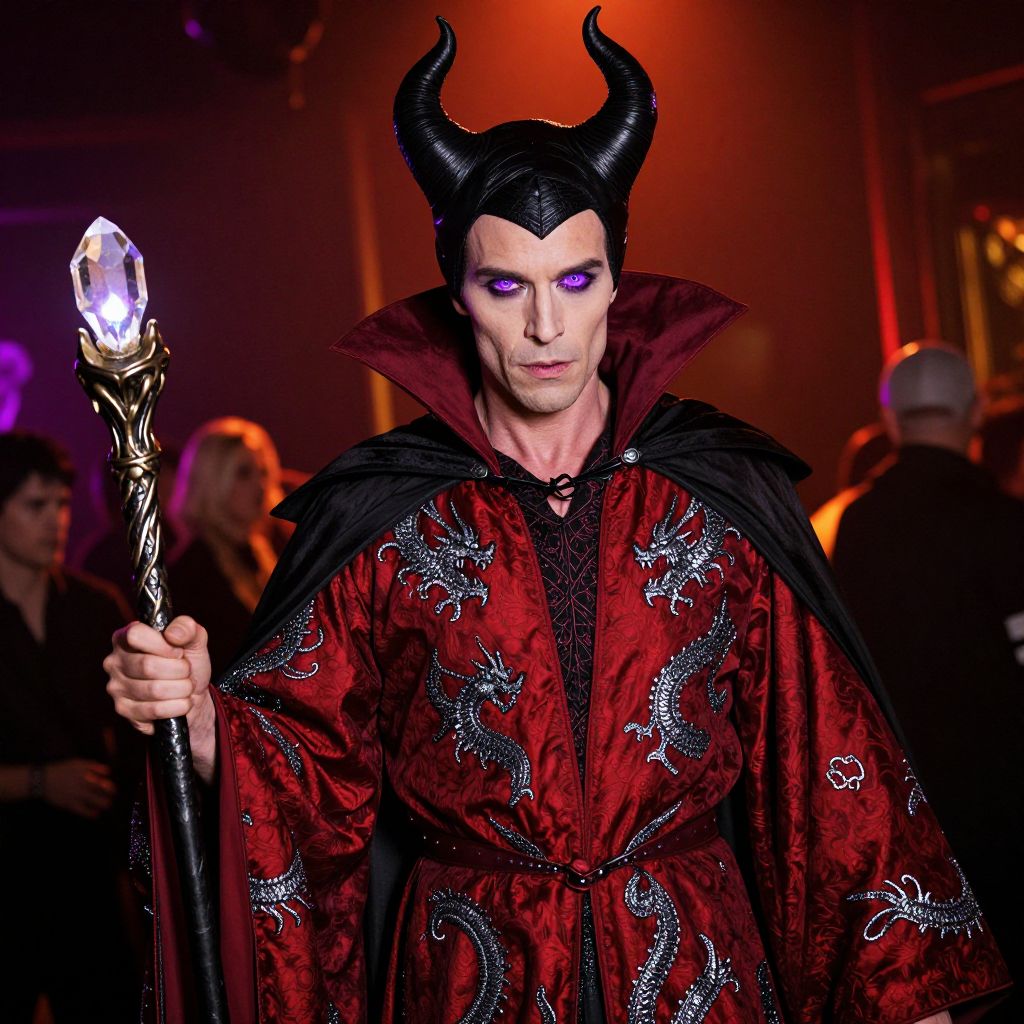 A festive Halloween party setting where a tall, confident man in a fully detailed 'Maleficent Halloween costume' stands in the foreground, wearing a layered crimson robe with silver dragon-like motifs, a wide black cloak, and a glowing purple eye patch. He is holding a vintage-looking staff with a glowing crystal. His face is strong and charismatic, with a sharp nose, angular jaw, and deep, piercing eyes that look directly into the camera.
