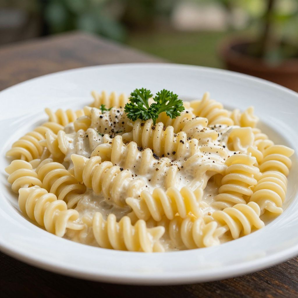 Close-up of a plato de pasta spirals coated in creamy Alfredo sauce, garnished with parsley and cracked black pepper, elegant white ceramic plate, soft natural light, with a blurred outdoor garden in the background, evoking a fresh and homemade feel.
