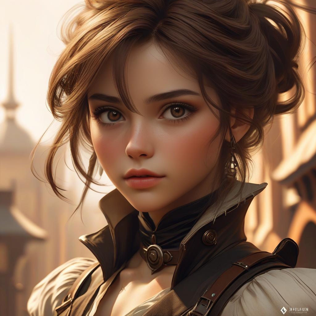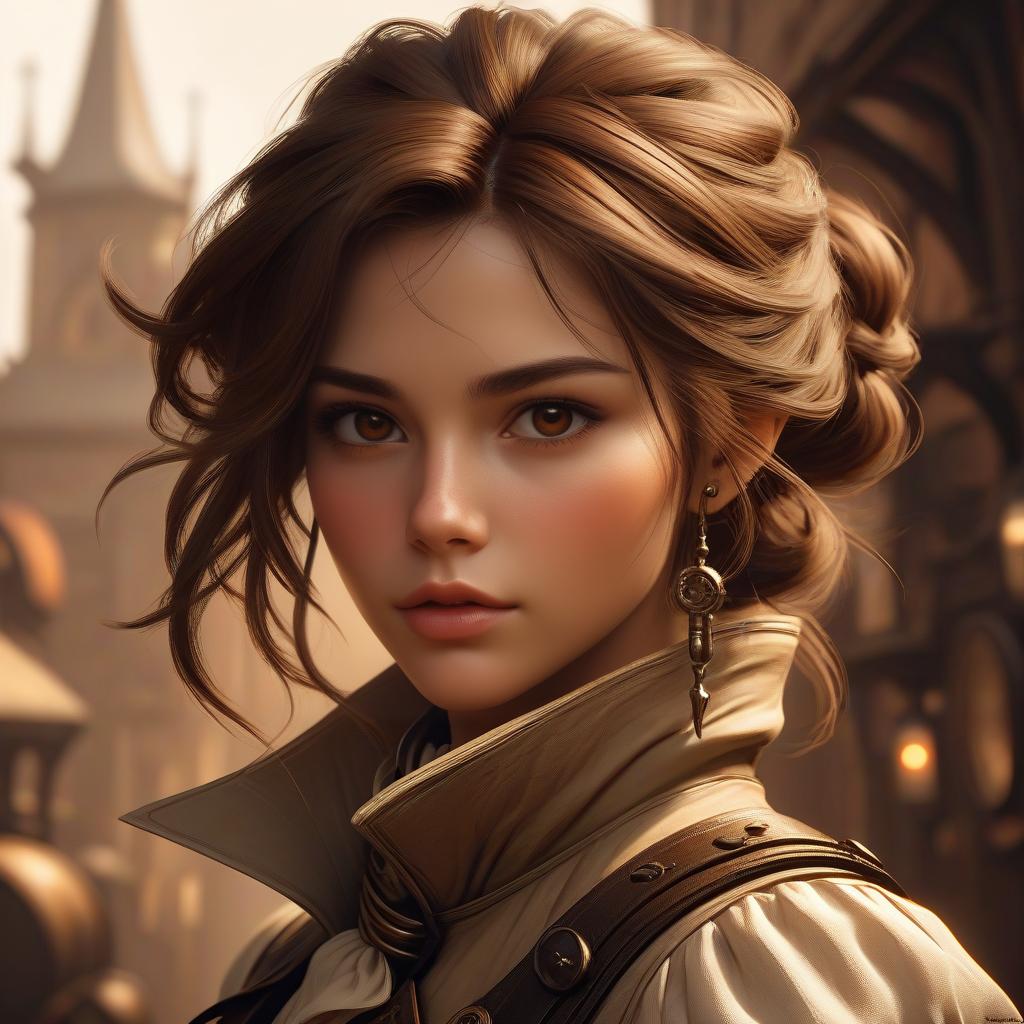Close-up portrait of a young woman with light brown wavy hair, smooth glowing skin, and light brown eyes. She is dressed in a dark brown leather garment with a metallic emblem on her shoulder. The background features a large ornate clock face, creating a vintage or steampunk aesthetic.