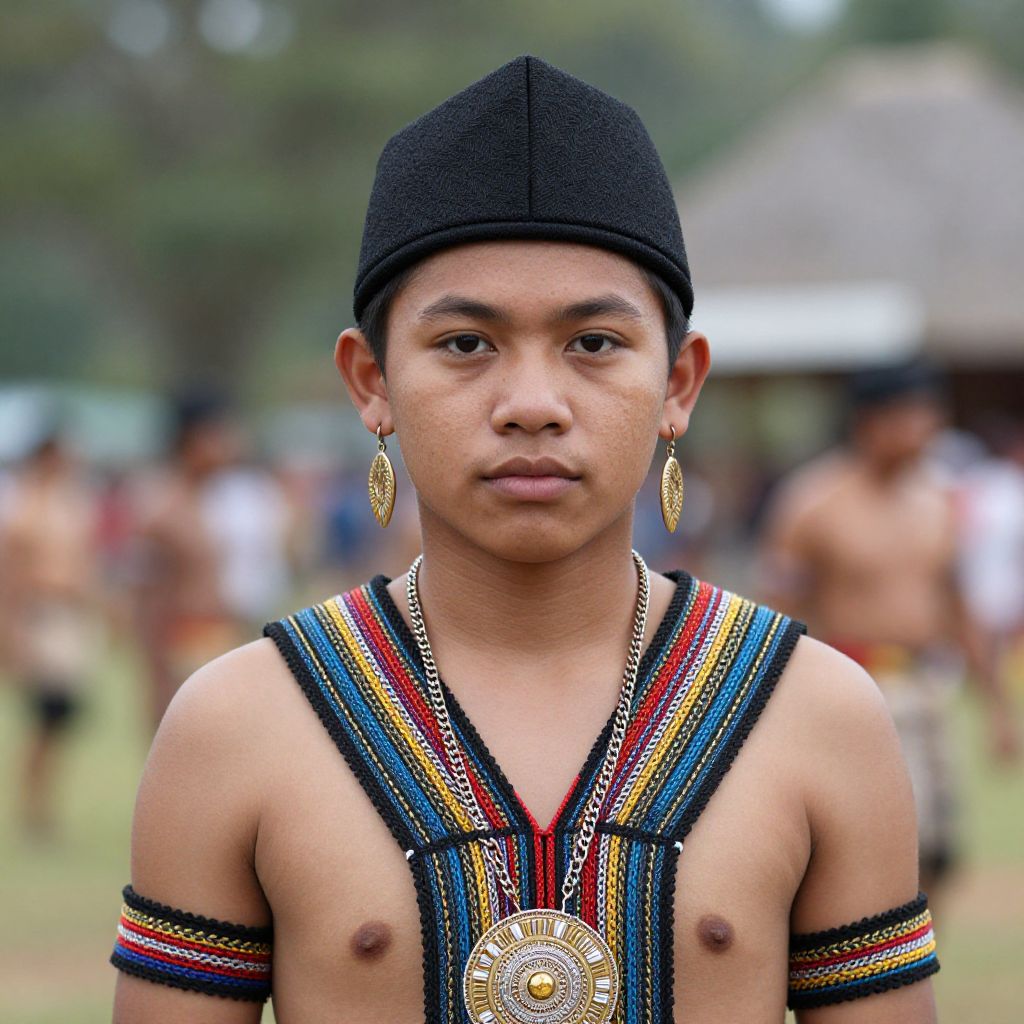 Filipino tribal costume, jewelry, solo, 1boy, earrings, male focus, black hair, necklace, blurry background, looking at viewer, hat, blurry, upper body, realistic