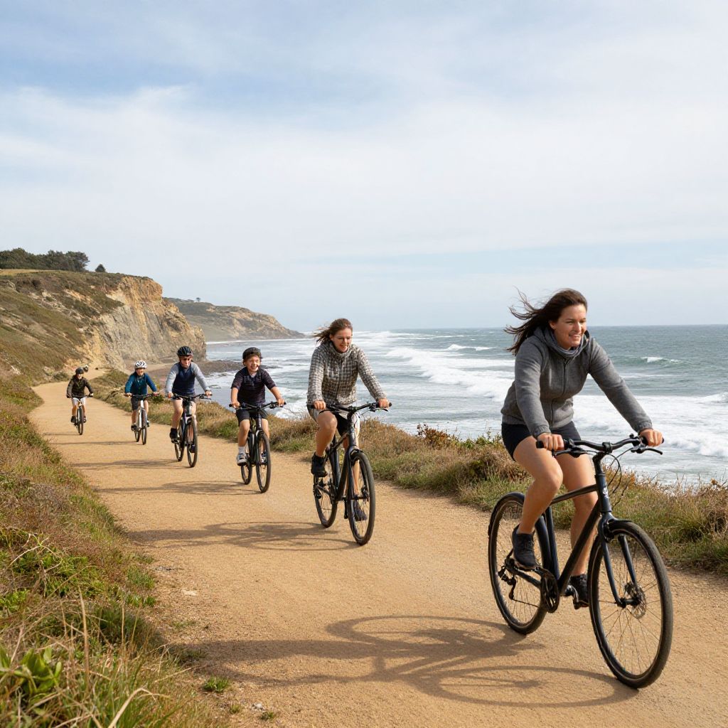 Bike riding prompt: A family enjoys a scenic bike ride on a coastal cliff path, waves crashing below, bright sky with soft clouds, children laughing, wind in their hair, warm natural tones, realistic outdoor scene.