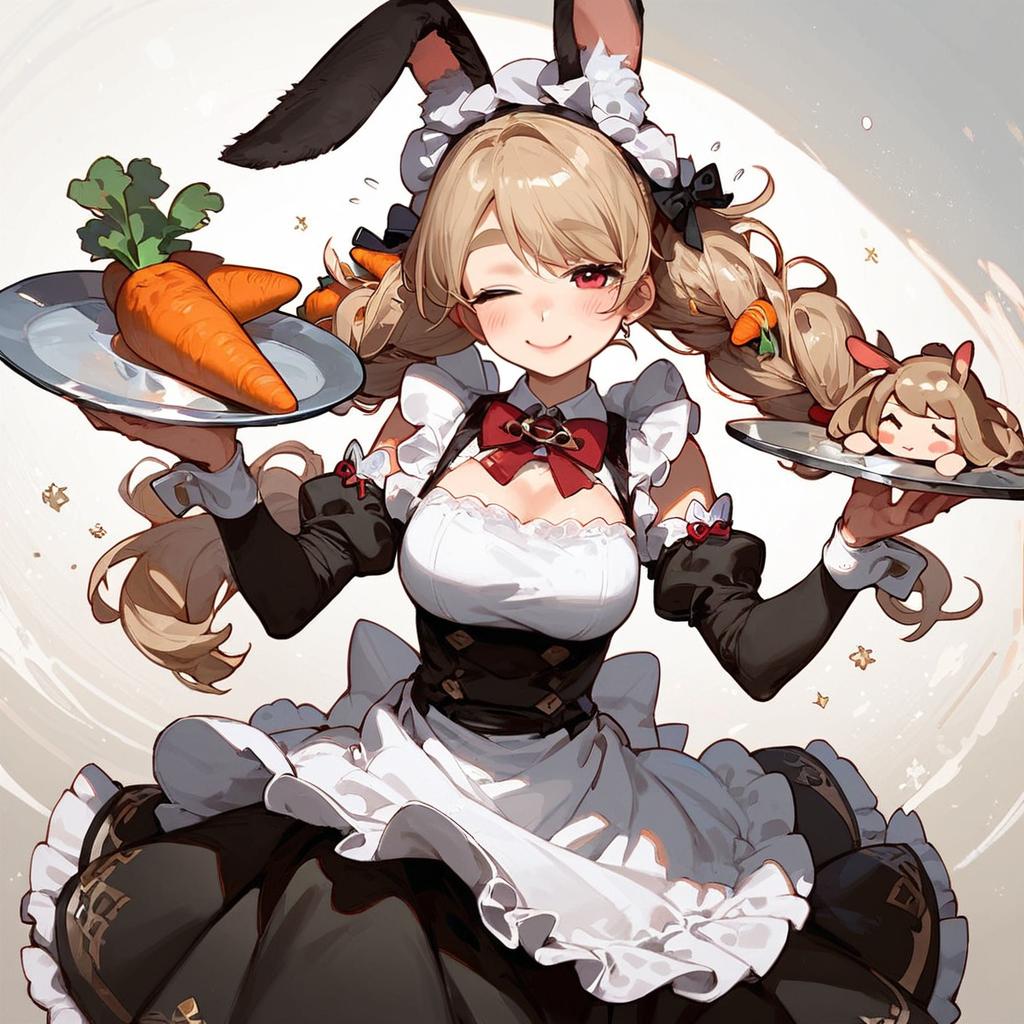 Score_9, score_8_up, score_7_up, uncensored, source_anime, 1girl, mature female, thick eyebrows, bunny-shaped pupils, rabbit ears, animal ear fluff, apron, dress, detached sleeves, bow, carrot hair ornament, blush, closed mouth, holding, holding tray, looking at viewer, smile, solo, 2014, doll, kadomatsu, new year