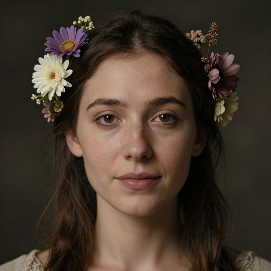 Portrait of a neanderthal woman, symmetrical face, flowers in her hair, she has the beautiful calm face of her mother, slightly smiling, ambient light