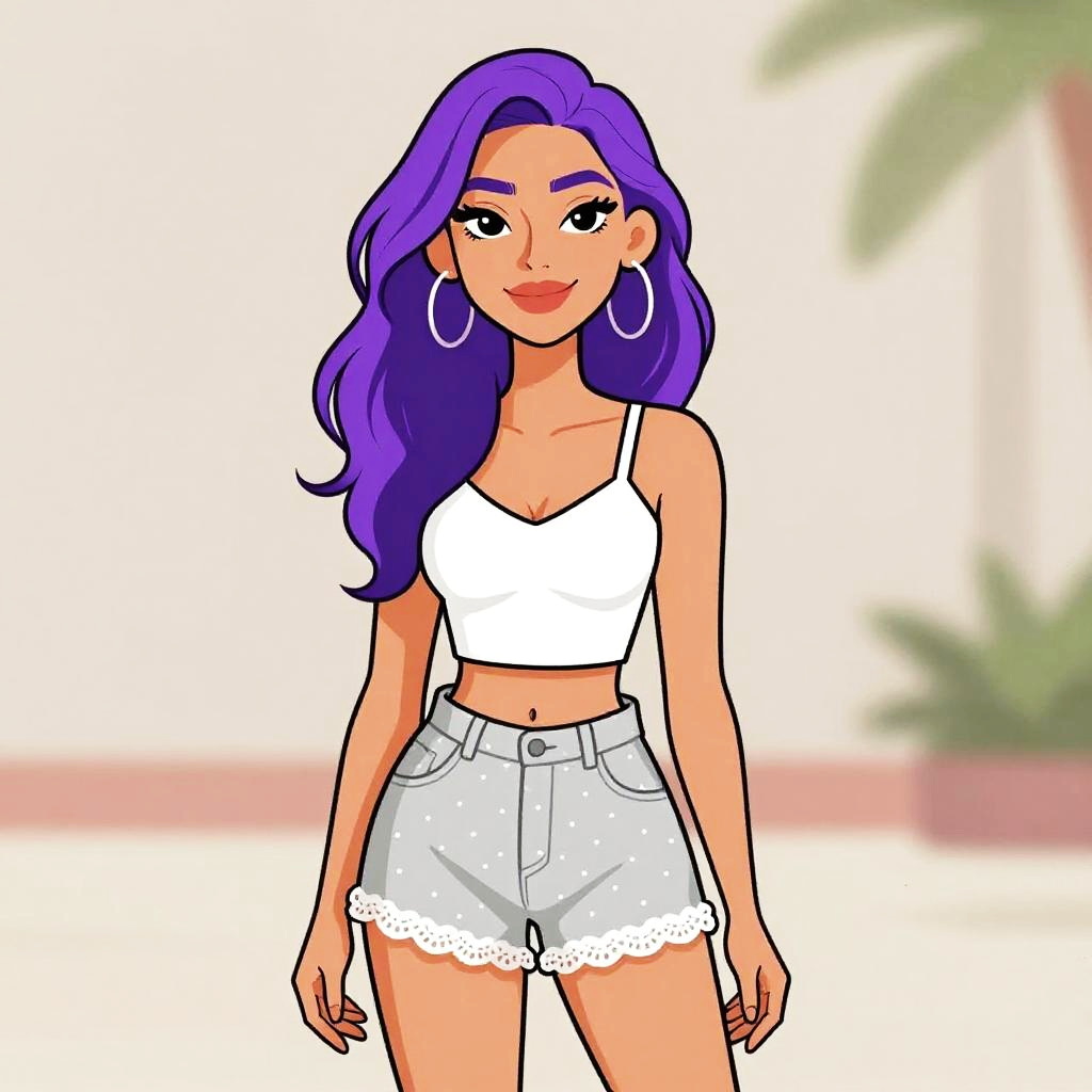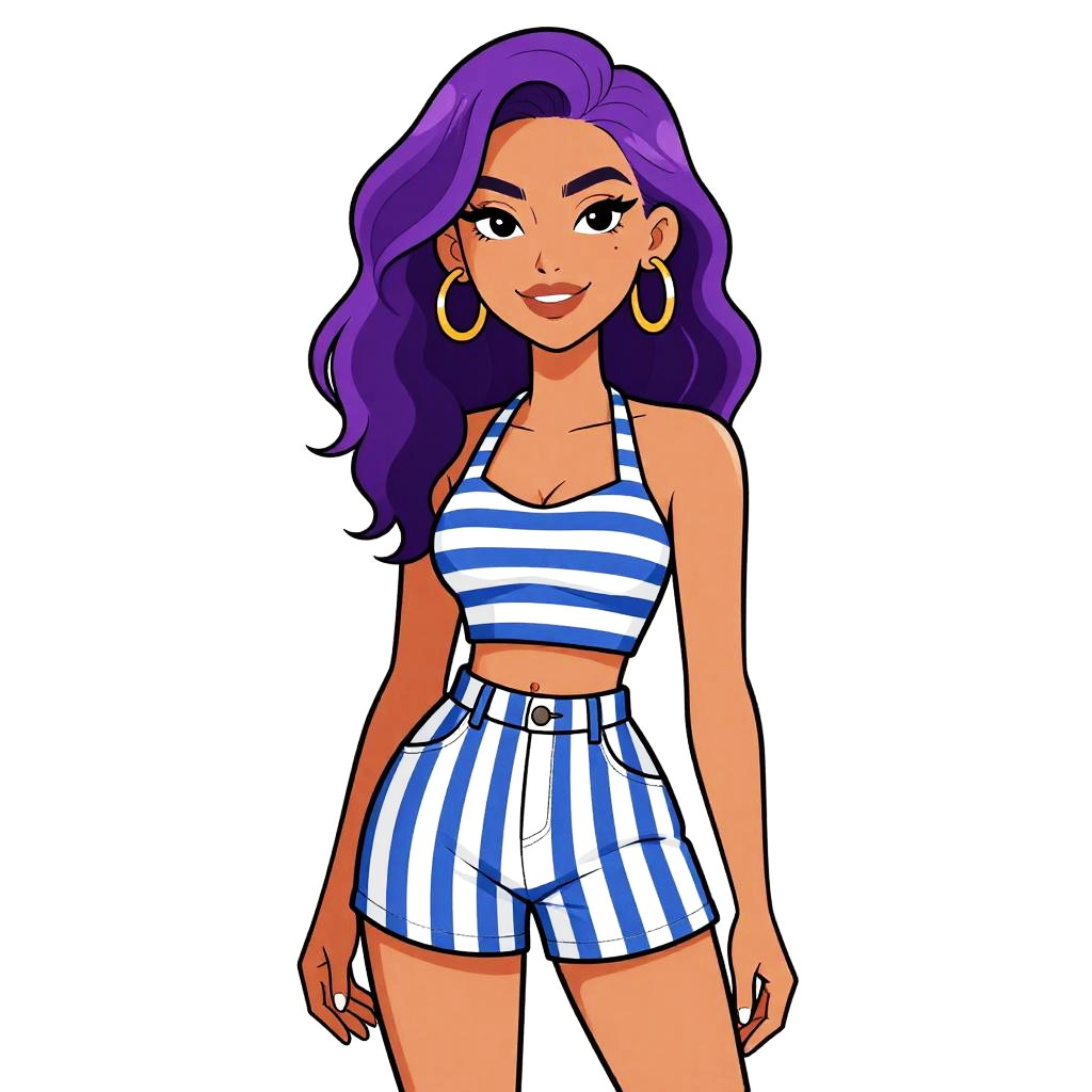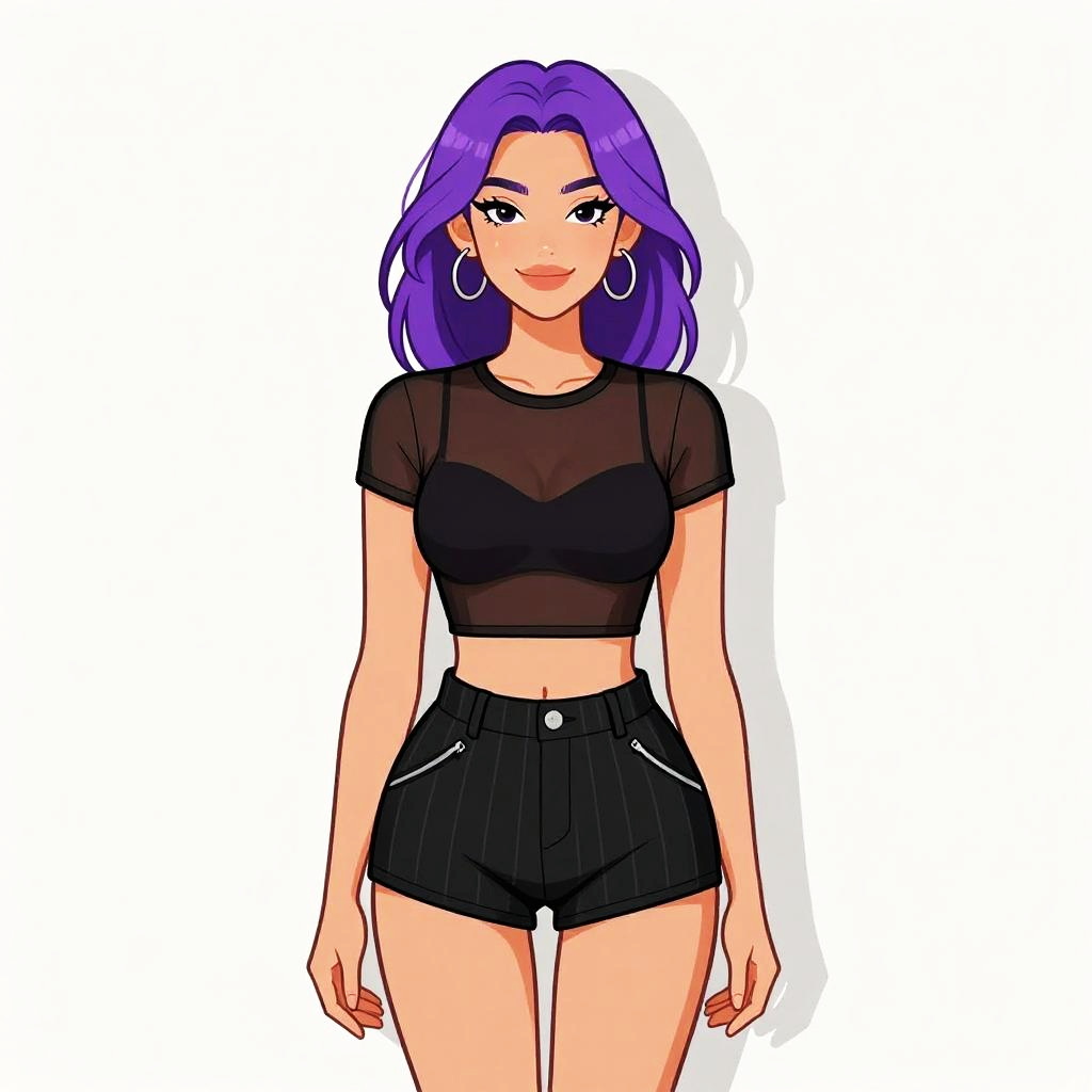 Woman with pretty face and pretty hair. Woman, modern casual, fitted checkered romper in black and white, square neckline, thin straps, short-length hem, plain white background. --sref 1467