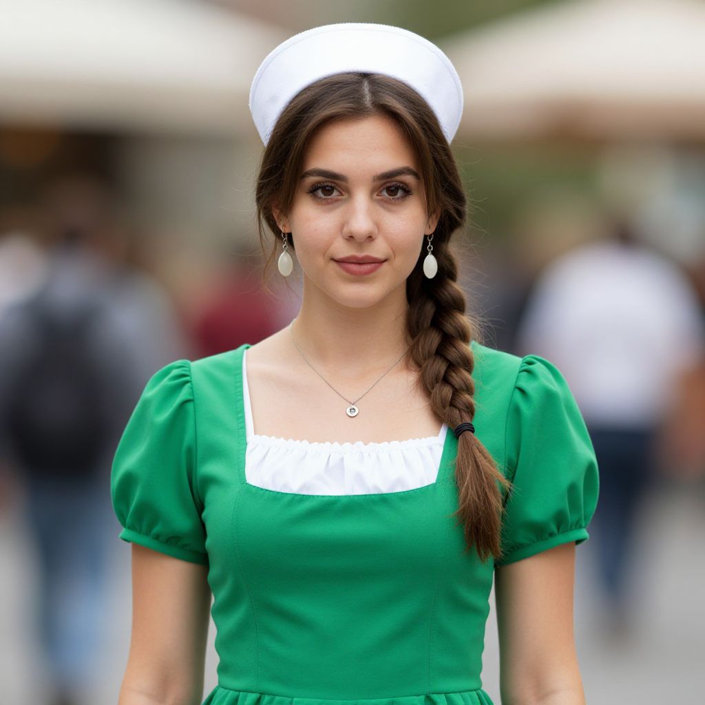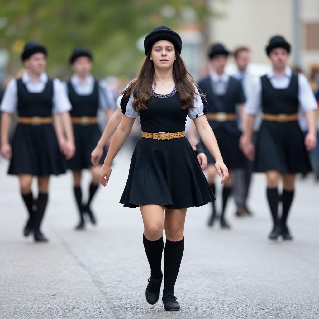 "irish step dancing costume, walking, 1girl, blurry, outdoors, belt, blurry background, brown hair, socks, hat, long hair, multiple boys, kneehighs, street, full body, dress, road Realistic photo of casual sexy person with pretty face"