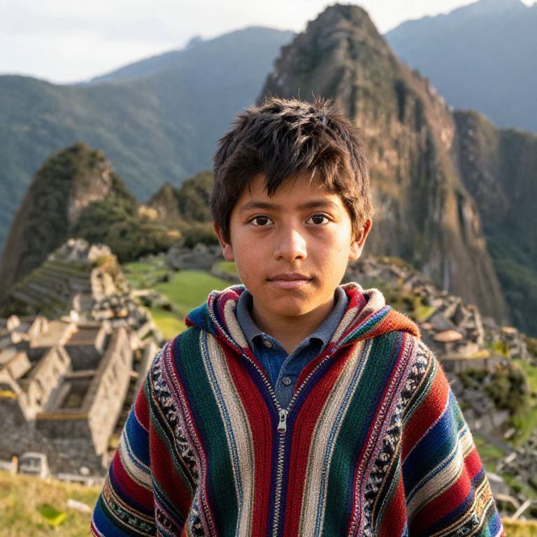 Peruvian boy playing traditional flute outdoors, dressed in indigenous attire, set against a backdrop of lush green valleys and towering peaks, early morning mist adding mystery to the scene
