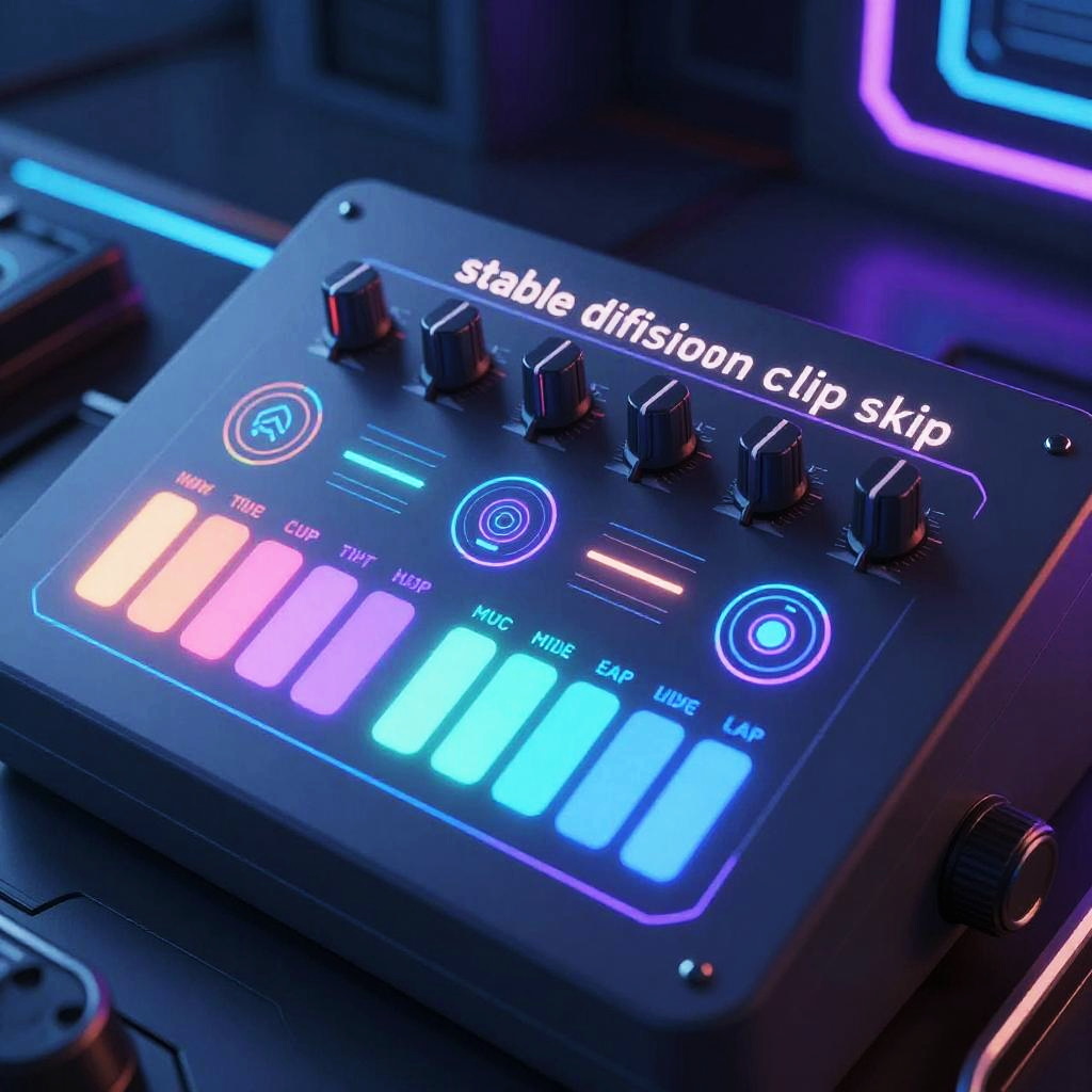 A sleek control panel showcasing the stable diffusion clip skip setting, with holographic controls, vibrant color-coded bars, and dynamic AI motifs, rendered in a cyberpunk style with neon blues and purples in a high-tech environment.