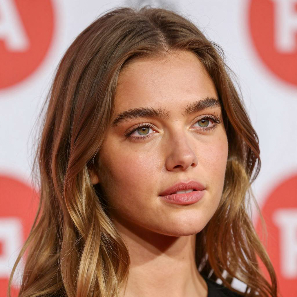 Photograph of a young woman with fair skin, blonde hair in an elegant updo, and blue eyes. She wears a black one-shoulder dress and long, intricate, dangling earrings. Background is a solid blue rectangle with a beige border. Her expression is neutral and focused. She is centered in the image.