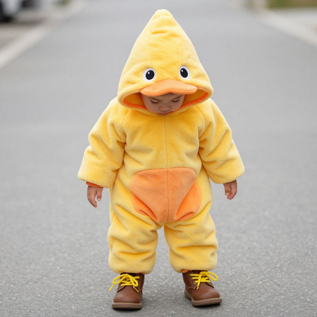 A small child is wearing a yellow and orange costume with a hood. The child is also wearing a pair of brown shoes with yellow laces.
