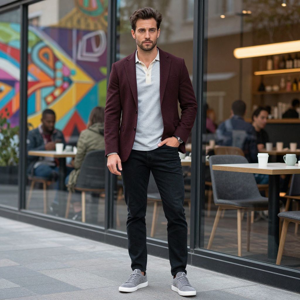 A man, burgundy blazer, light gray dress shirt, cream henley, fitted black jeans, gray suede sneakers, modern glass facade, vibrant street art, bustling cafes, cinecolor, confident expression Man has masculine face and piercing eyes