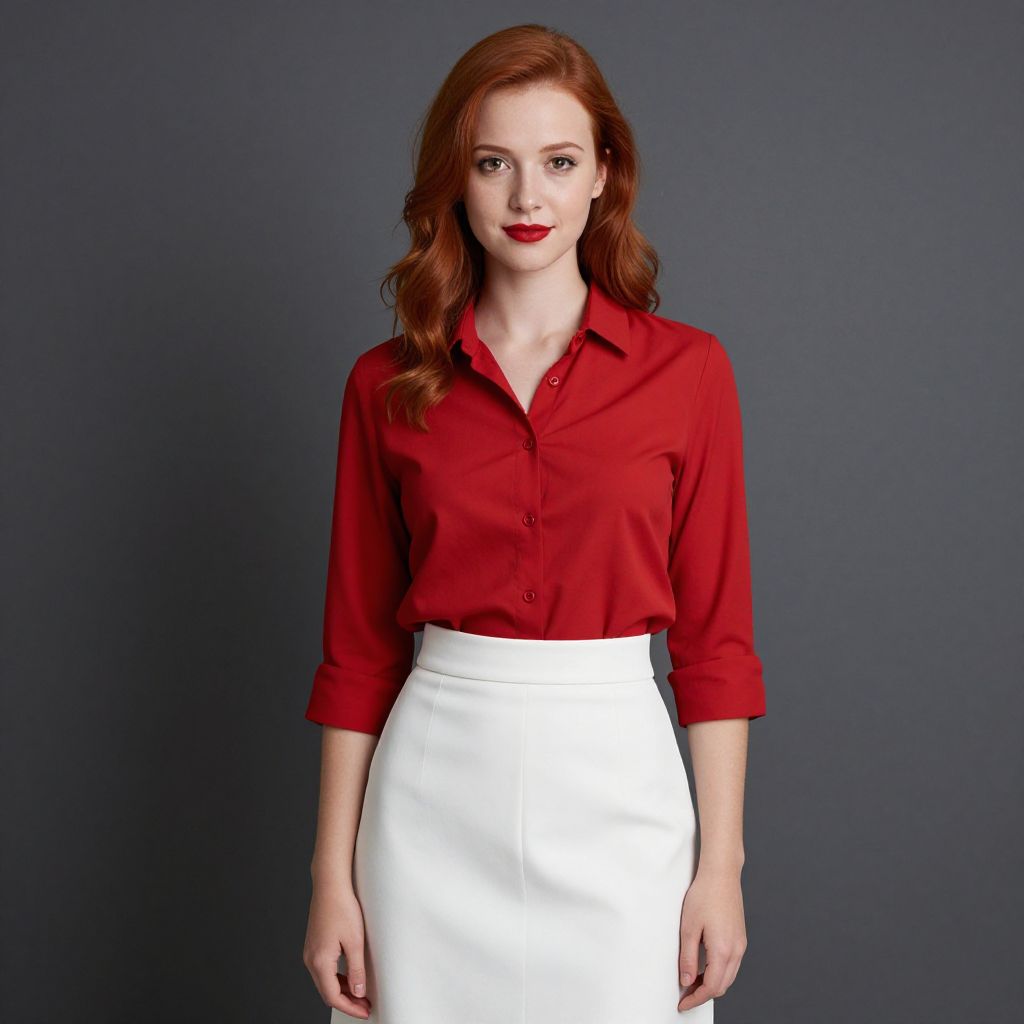 Photograph of a fair-skinned woman with long, wavy red hair and red lipstick, standing against a solid dark blue background. She wears a vibrant red button-up shirt with the sleeves rolled to the elbows, and a high-waisted white pencil skirt. Her expression is neutral, and she looks directly at the camera. The contrast between her red shirt and white skirt creates a striking visual effect. The lighting is even, highlighting her features and the colors of her clothing.