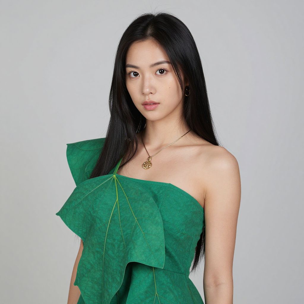 Photograph of an Asian woman with long black hair, wearing a strapless green leaf-inspired dress, gold necklace, and neutral expression, against a plain