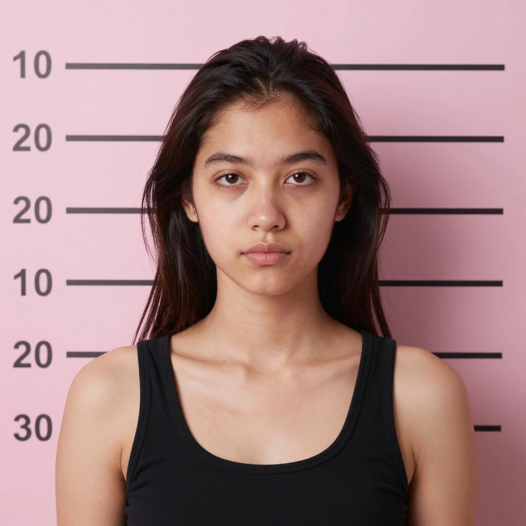 Photograph of a young woman with long, wavy black hair, medium brown skin, and dark brown eyes. She wears a black t-shirt with a small on the left side. She has full lips and a neutral expression. Her head is slightly tilted to the left. The background is a white, ured wall.