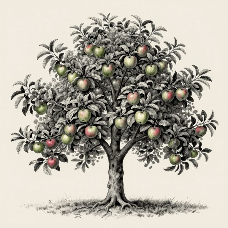 The image depicts a detailed, monochromatic drawing of a mature apple tree. The tree stands prominently in the center, its branches extending outward in a natural, organic manner. The trunk is robust and textured, with visible roots spreading out at the base, anchoring the tree firmly to the ground. The branches are adorned with numerous apples, varying in size and stage of ripeness, creating a rich tapestry of colors from green to red. The leaves are intricately drawn, with veins and edges clearly defined, adding depth and realism to the foliage. The overall composition is balanced, with the tree occupying a significant portion of the frame, and the background remaining a neutral, light beige, allowing the tree to stand out prominently. The drawing style is highly detailed, with fine lines and shading techniques that enhance the texture and depth of the tree, making it appear almost three-dimensional.