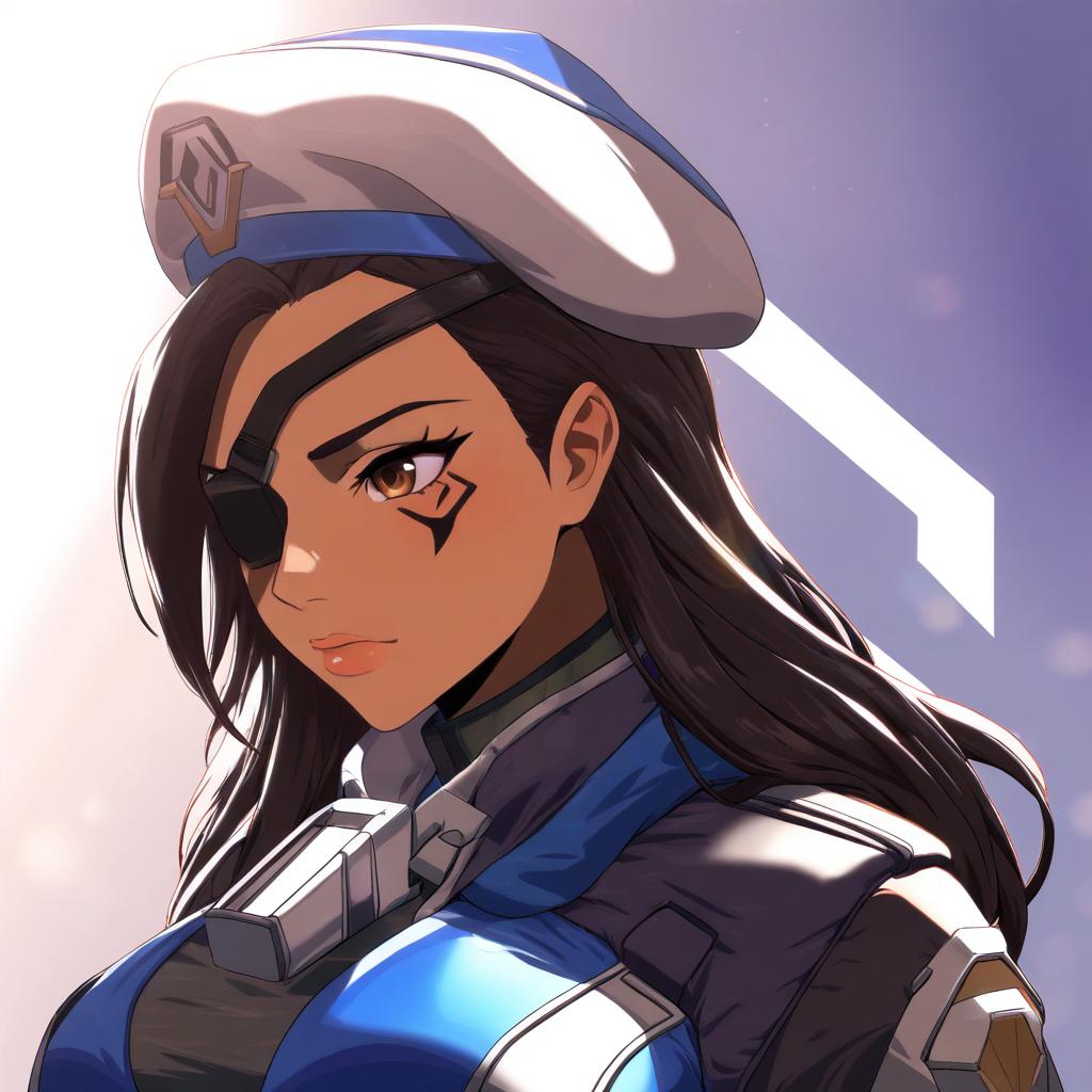 Ana (overwatch), overwatch, 1girl, dark-skinned female, lips, brown eyes, eyepatch, long hair, black hair, large breasts, facial tattoo, facial mark, nose, beret, by artist fuyumi kazuki, illustrious