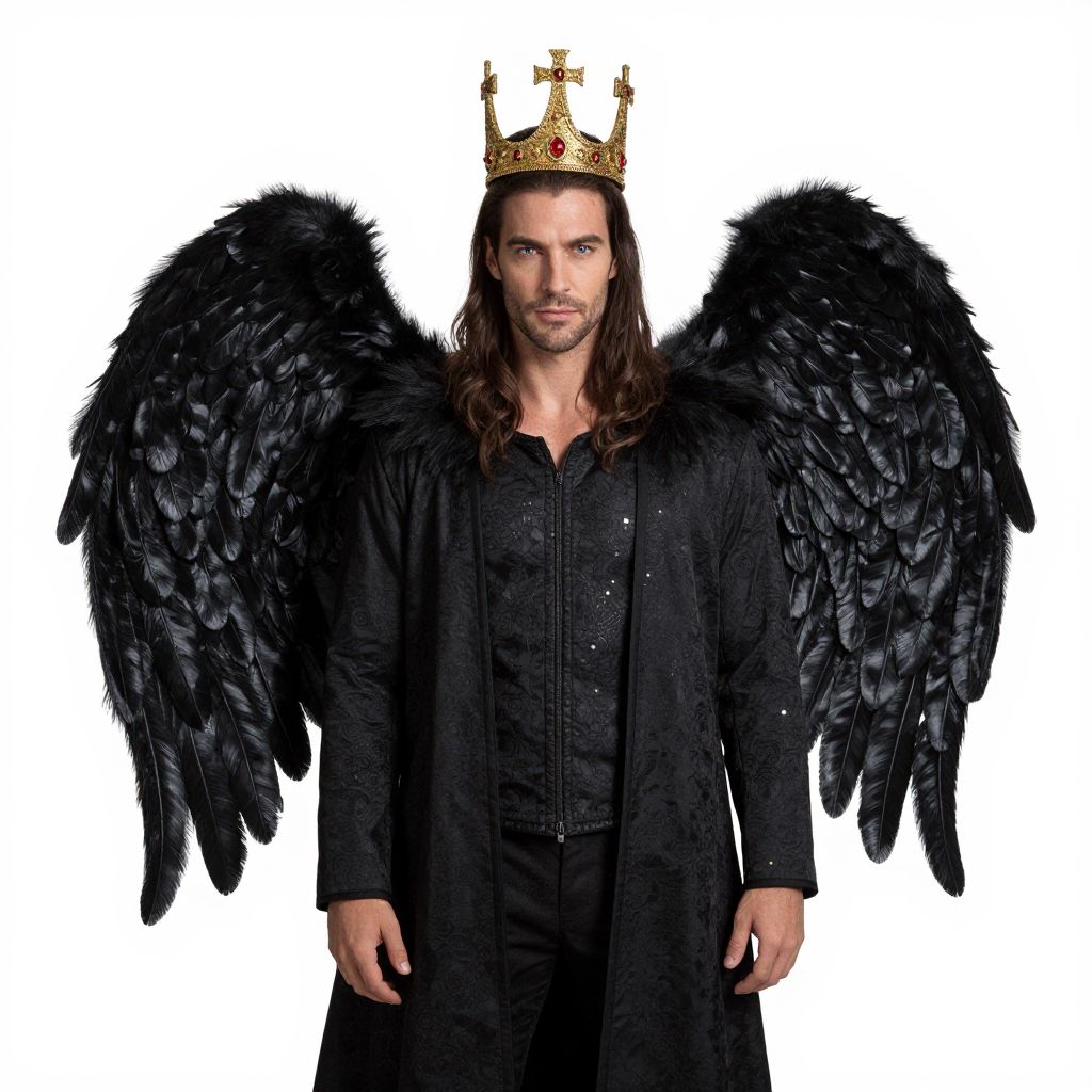 Photograph of a long-haired man in a black coat and crown, with large black feathered wings, standing against a white background.