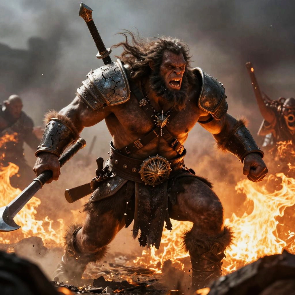 Photorealistic CGI of a muscular, roaring minotaur with brown fur, large horns, and a leather belt, charging in a dusty arena with