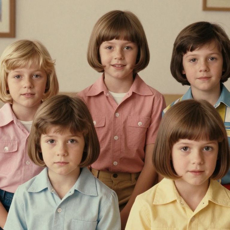 Vintage-style portrait of bowl haircut kids in 80s fashion, muted pastel colors, soft grain texture, warm indoor lighting, nostalgic atmosphere, candid expressions