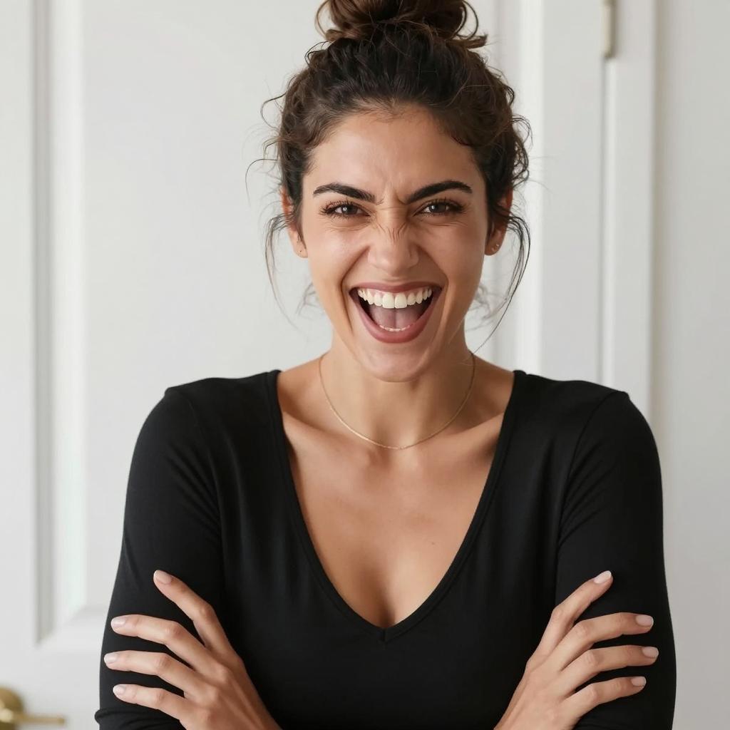 Woman with long black hair, light skin, and green eyes, smiling at the camera. She wears a black sleeveless top and a thin gold necklace. She sits on a light gray couch with a beige blanket and gray pillow in the background. Her right arm is extended towards the camera. Photographic image.