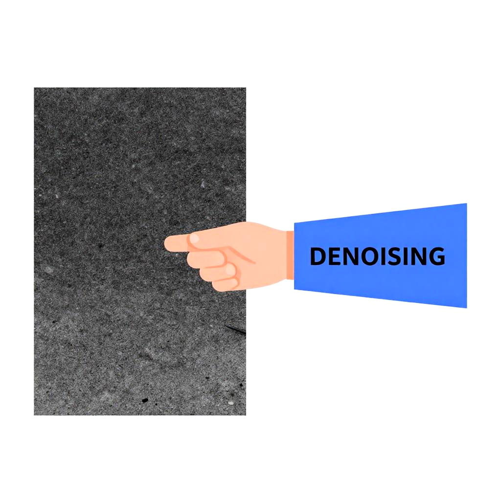 Illustration of what is denoising process in image processing, a noisy photo on one side morphing smoothly into a clean, noise-free photo, modern graphic design