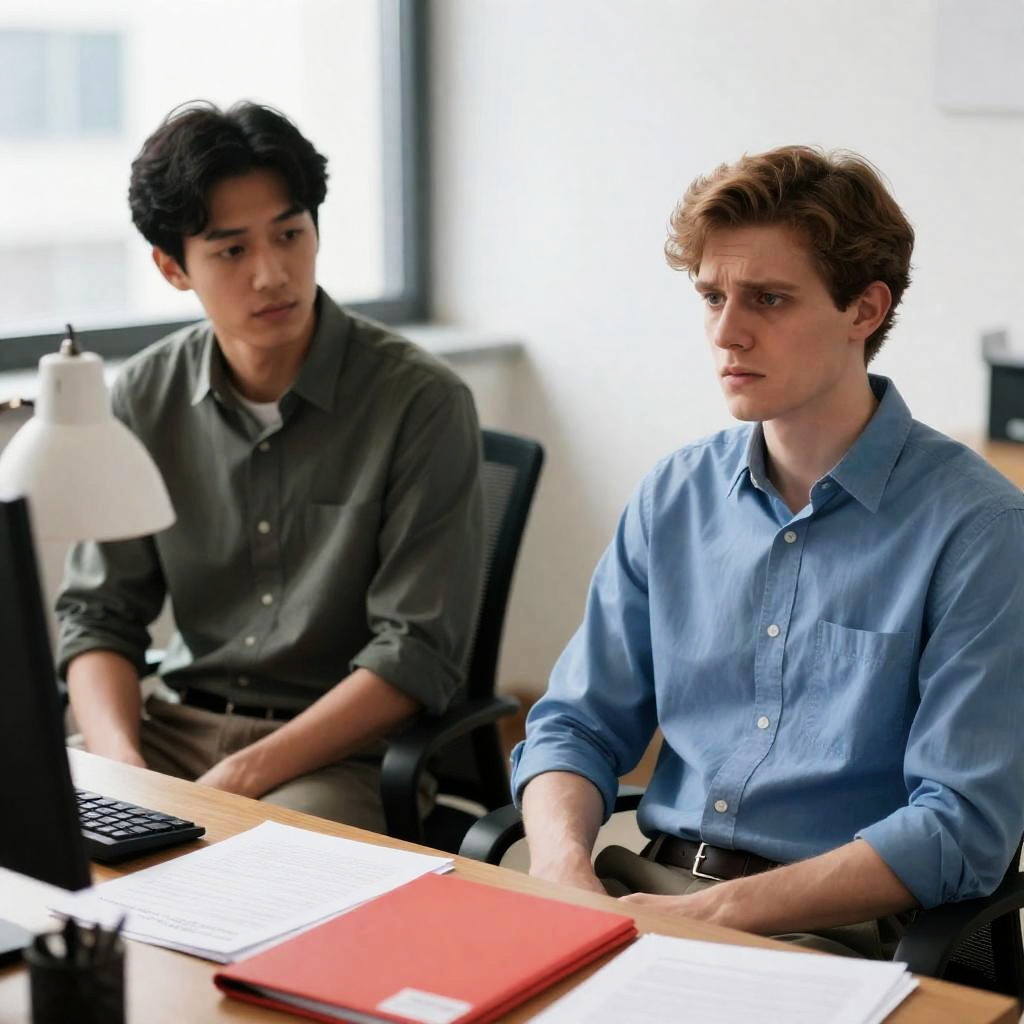 Two men in an office. Seated man with light blue shirt, dark tie, and short brown hair, adjusting tie, looks up. Standing man with white shirt, gray tie, and bald head, holds black phone. Office has desk, lamp, framed picture, Christmas tree, and documents. Seated man has intense gaze, standing man neutral expression.