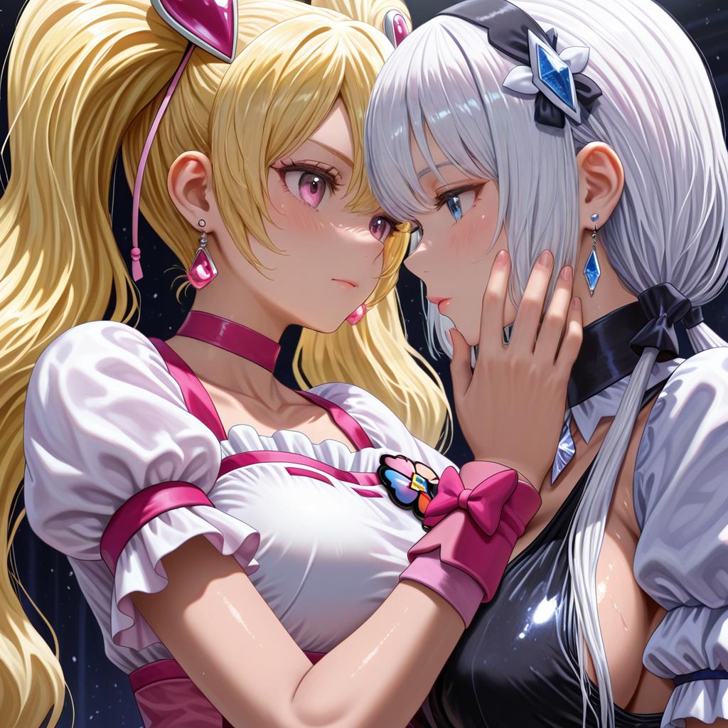 Digital artwork of two anime-style magical girls in an intimate close-up pose. One character has long blonde twintails, pink eyes, and wears a white and pink outfit with heart-themed accessories, including heart earrings and a pink choker. The other character has long white hair, blue eyes, and wears a black and white outfit with blue gem accessories. Both characters exhibit detailed facial expressions and glossy skin highlights, set against a dark background.