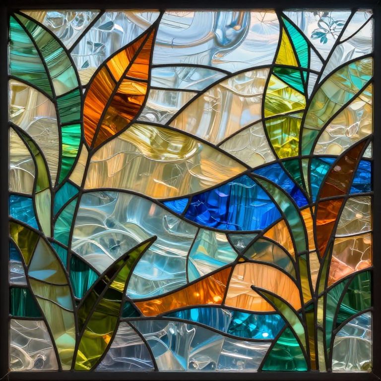 Abstract stained glass designs inspired by nature, incorporating organic shapes like leaves and waves in vivid color palettes, highlighted by translucent glass textures and radiant light reflections, producing a harmonious balance between chaos and order.