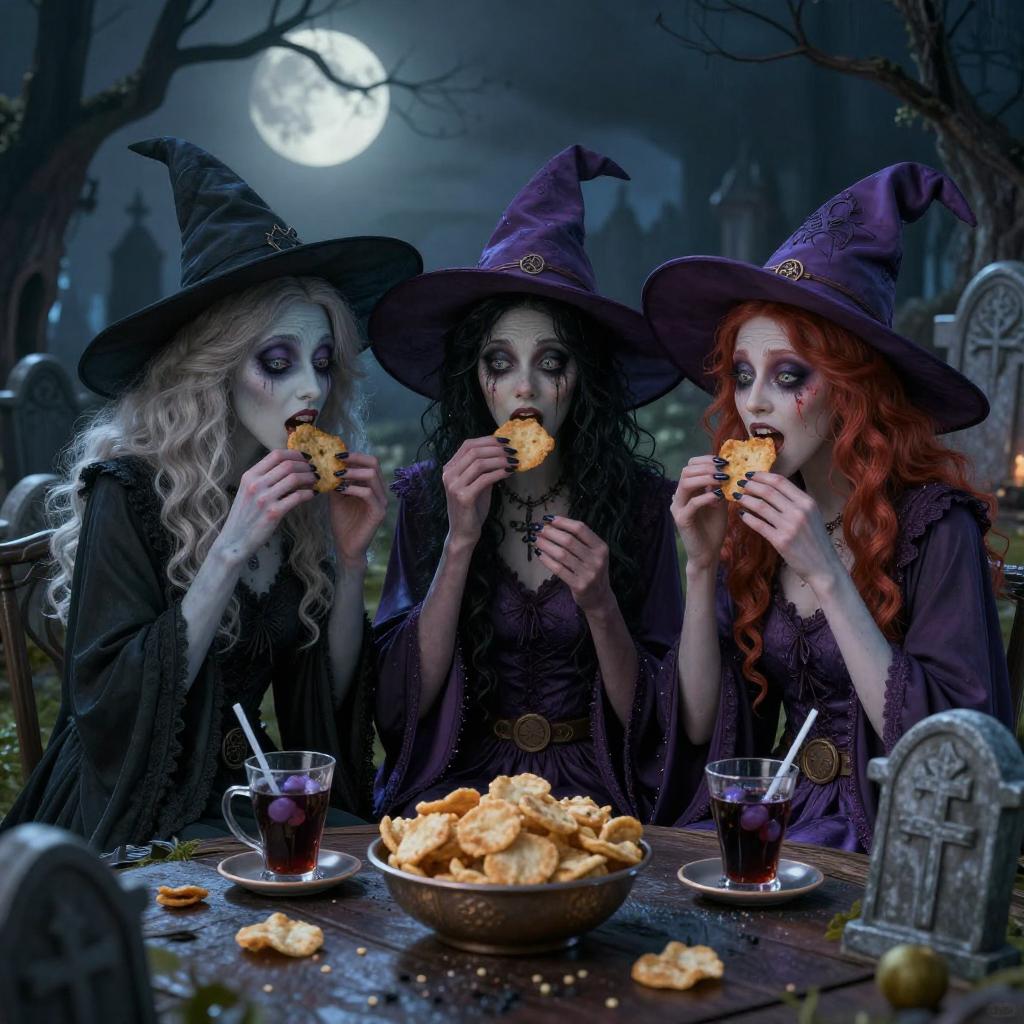 Three witches with pale faces, black dresses, and purple hats, eating chips under a full moon in a spooky graveyard.