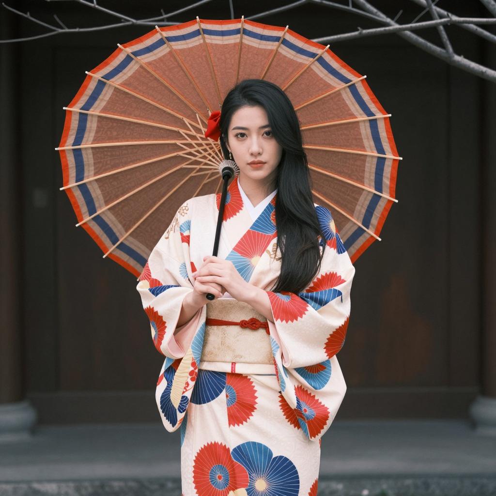 Asian woman in snow-covered forest, wearing elaborate pink floral headpiece with turquoise feather, long brown hair, white lace veil, red and pink patterned kimono, holding hands near chest, snowflakes falling around, standing slightly turned to the right.