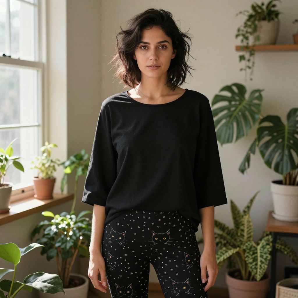 A young adult woman, early 30s, with warm brown eyes and natural curly black hair, stands in a cozy urban apartment, wearing a stylish blue hoodie with a large, bold animal graphic of a fox painted in vibrant red and orange on the front, sitting on a window seat with sunlight streaming in, soft bokeh background of city rooftops and greenery outside.