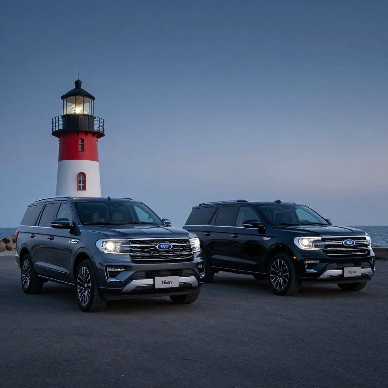 Two sleek Ford Expedition SUVs, one in dark gray and the other in glossy black, are showcased side by side, highlighting their robust design and modern features against contrasting backdrops—one near a lighthouse by the sea and the other under a twilight sky.