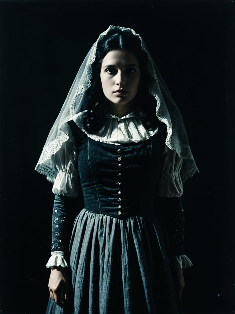 Woman in Llorona costume, waist-up studio portrait with dramatic shadows