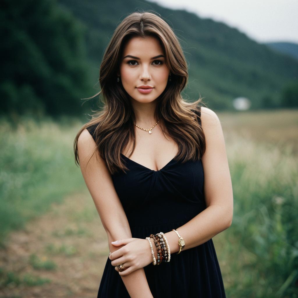 Adventures captain,1girl, jewelry, blurry background, blurry, solo focus, realistic, brown hair, dress, looking at viewer, outdoors, bracelet, lips