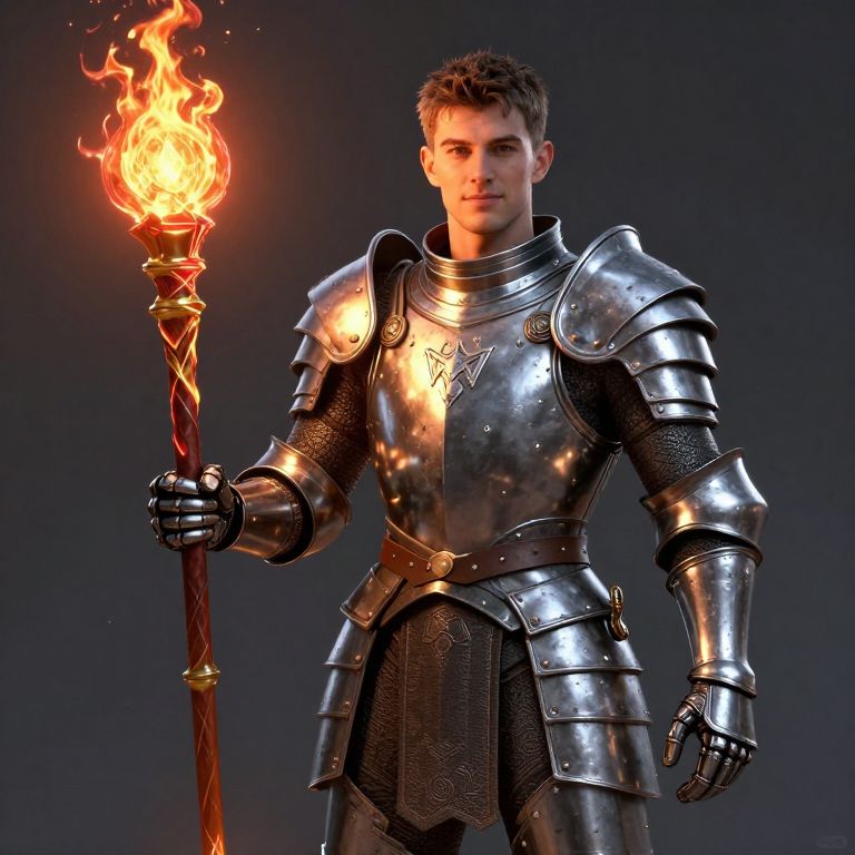 Photorealistic digital illustration of a young, handsome man with short brown hair, wearing shining silver medieval armor. He stands against a dark gradient background, holding a tall, ornate staff with a bright, flaming torch at the top. The armor has detailed engravings and a black, textured underlayer. His expression is confident and serious. The fire casts a warm glow on his armor, highlighting its metallic texture. The image has a realistic, CGI style with high attention to detail and lighting.