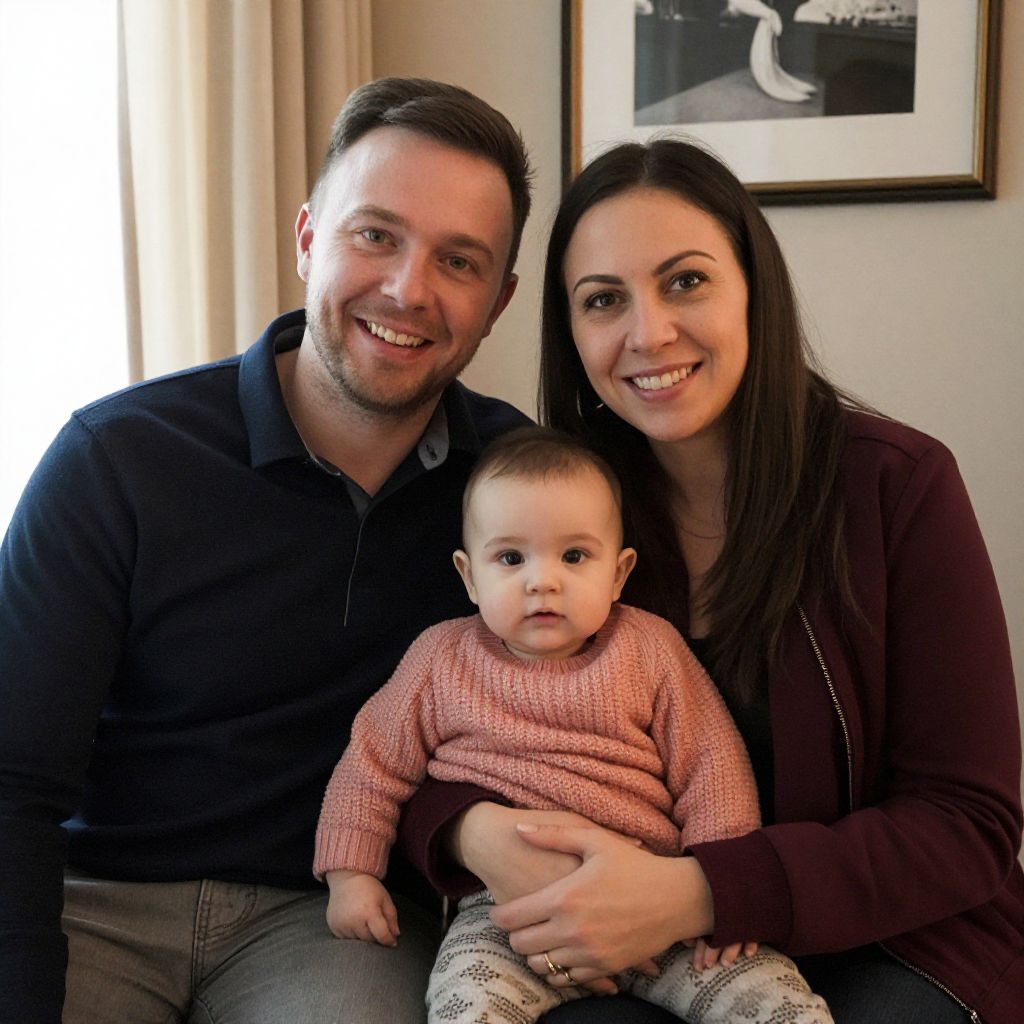 Photograph of a smiling Caucasian family of three. The father, with short dark hair and a beard, wears a black polo shirt and blue jeans. The mother, with dark hair in a ponytail, wears a maroon jacket and blue jeans. She holds a baby with light brown hair, dressed in a pink knitted sweater and dark pants. They sit on a couch in a brightly lit room with a framed picture on the beige wall behind them. The father's left hand rests on the couch, and the mother's right hand cradles the baby. The family's expressions are warm and happy.