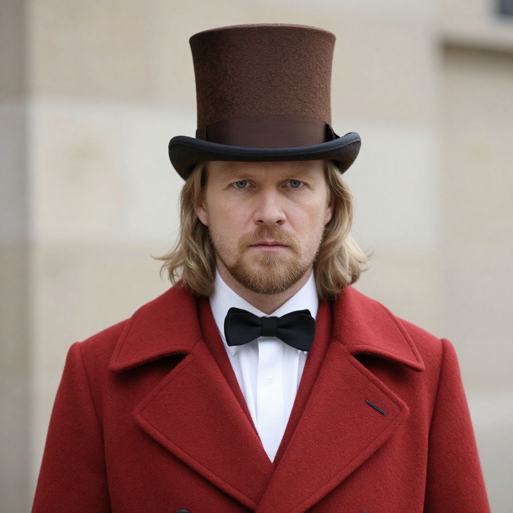 Photograph of a serious-looking white man standing against a clear blue sky. He's wearing a bright red double-breasted coat with gold buttons and a black beret. His short, light brown hair is mostly covered by the beret, and he has a slight mustache. The coat looks thick and formal, contrasting sharply with the bright blue background. He's looking directly at the camera.