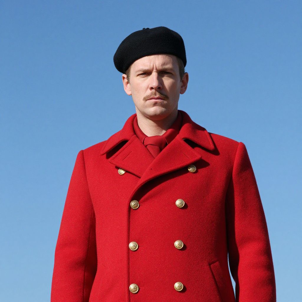 Photograph of a white man with a serious expression, wearing a black beret and a vibrant red double-breasted coat with gold buttons. He has fair skin and short dark hair, and his coat contrasts sharply with the clear, bright blue sky in the background. The image is sharply focused, emphasizing the textures of the coat and the smoothness of his skin. The man is centered in the frame, and the overall composition highlights the striking color contrast between his red coat and the blue sky.