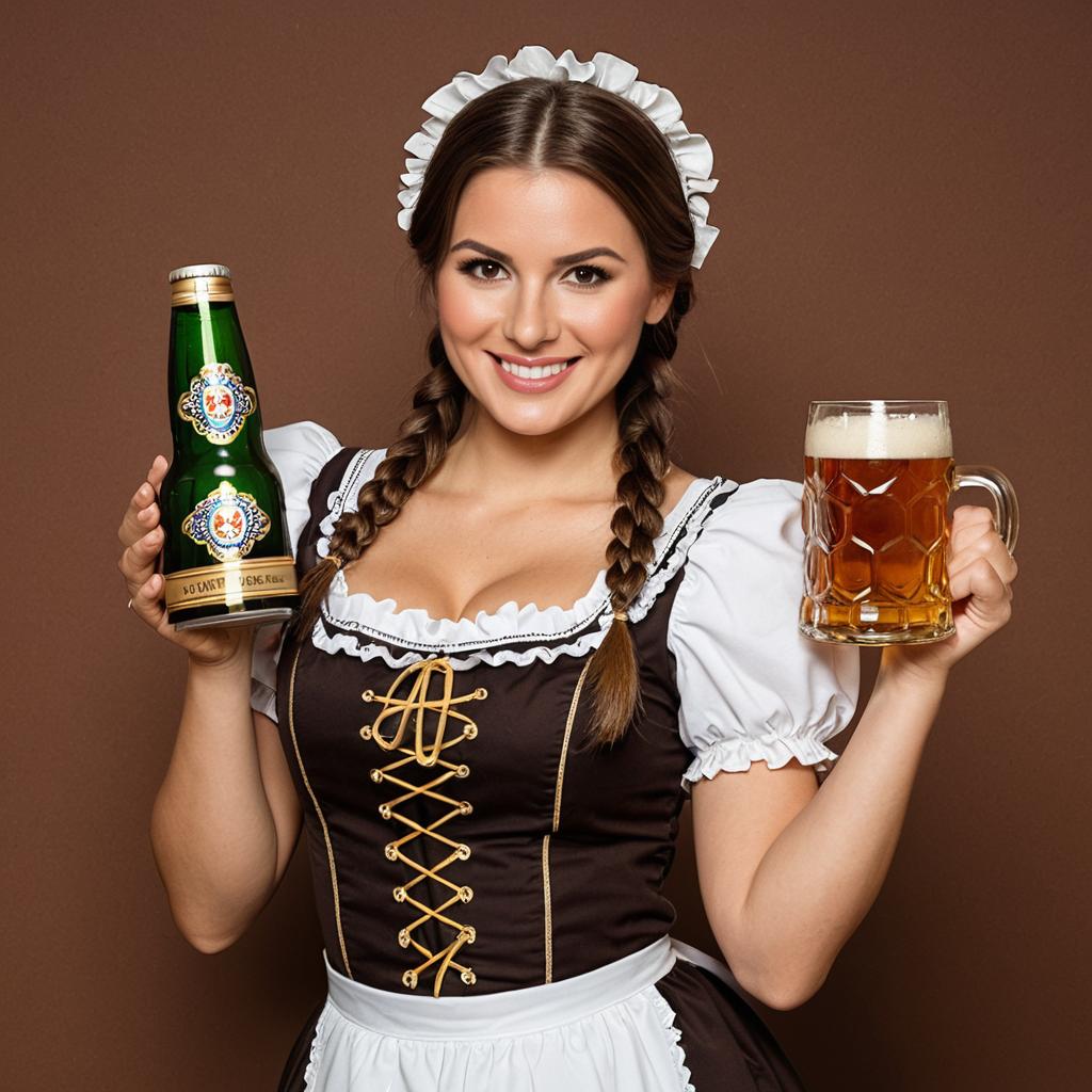 A young woman wearing a traditional Bavarian dirndl dress with brown and white colors, featuring short puffed sleeves and a white apron. She has brown braided hair and brown eyes. She is smiling and holding a glass beer mug filled with beer in one hand and a green beer bottle in the other, standing against a brown background.